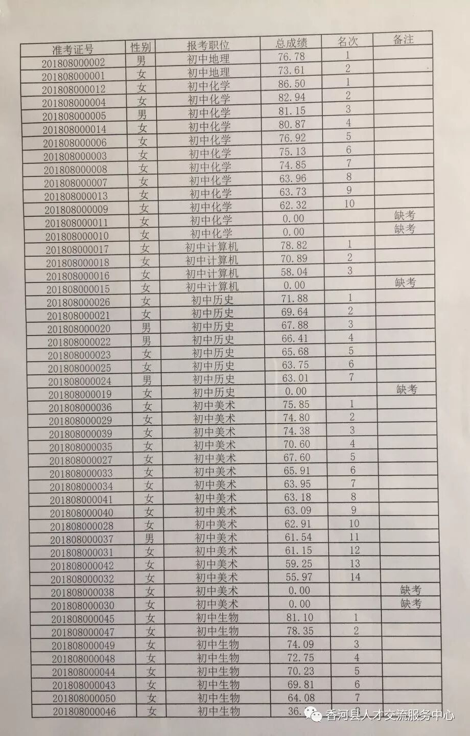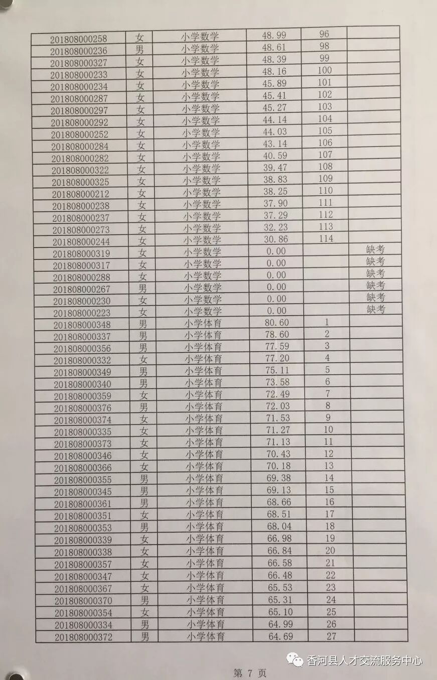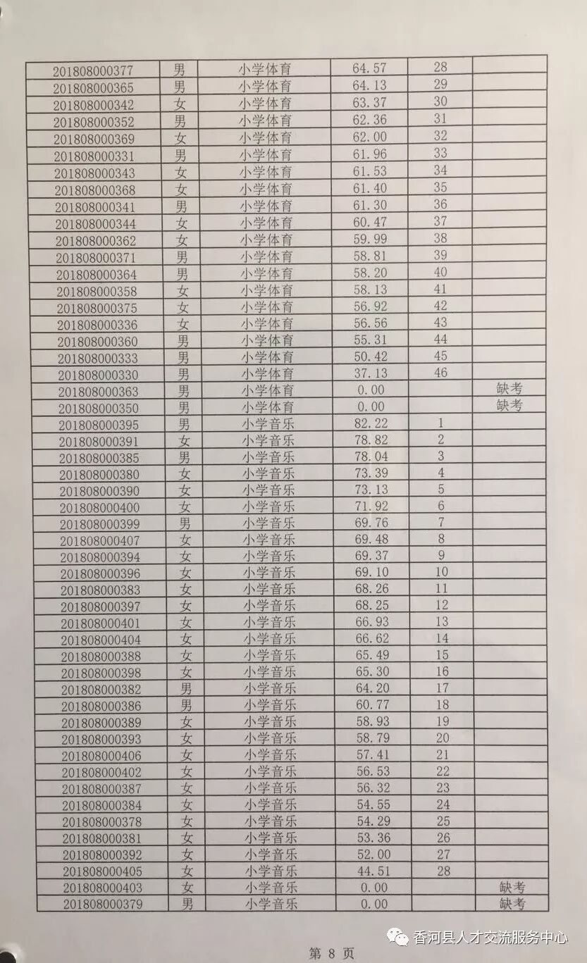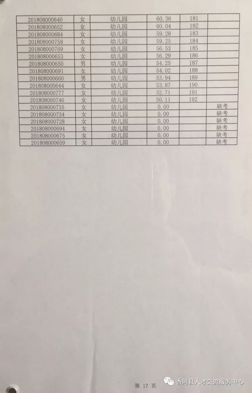 廊坊香河县2018年招聘合同制教师笔试成绩及排名