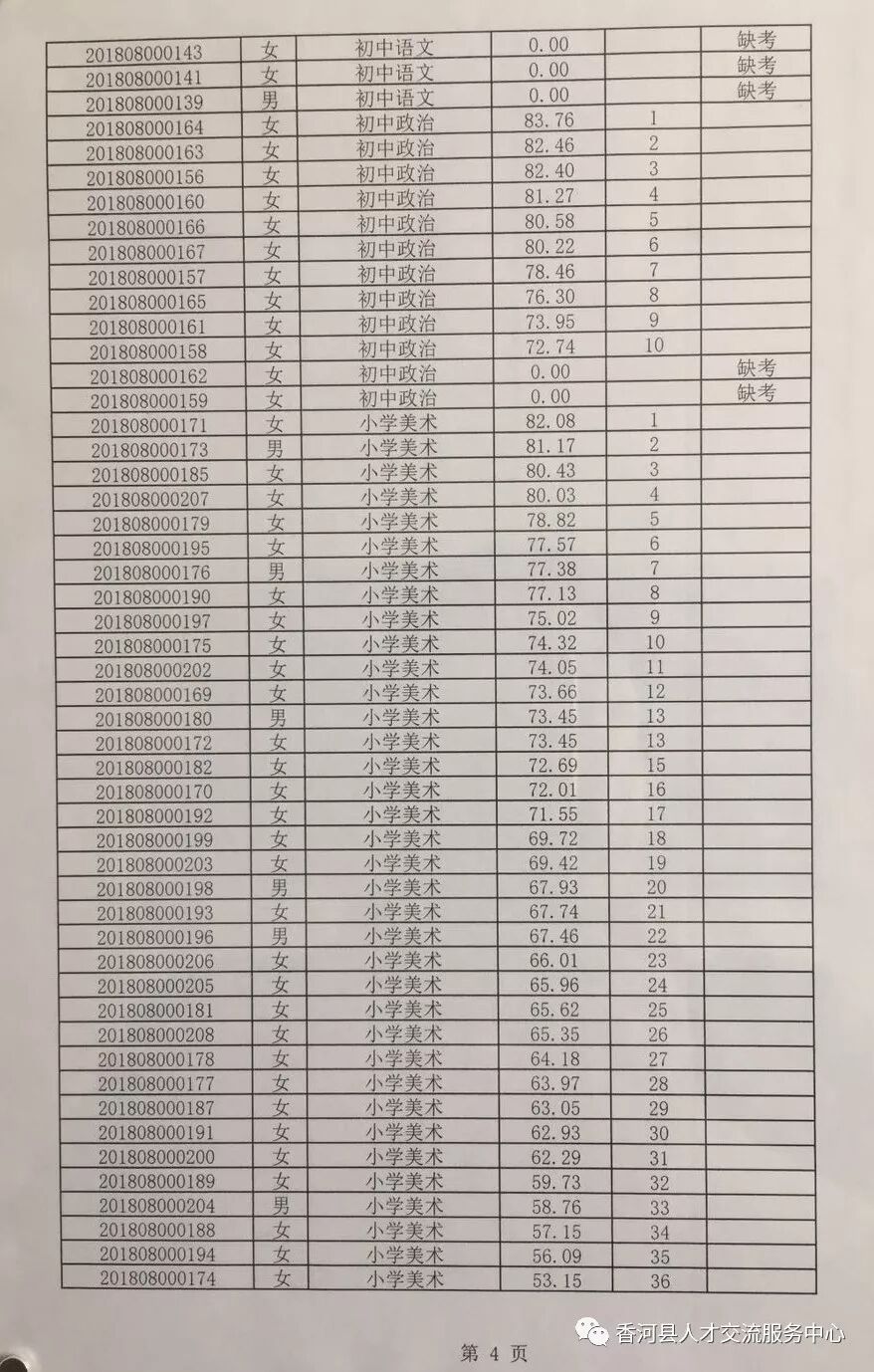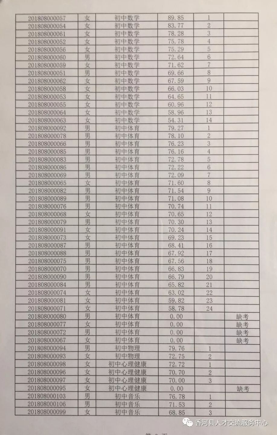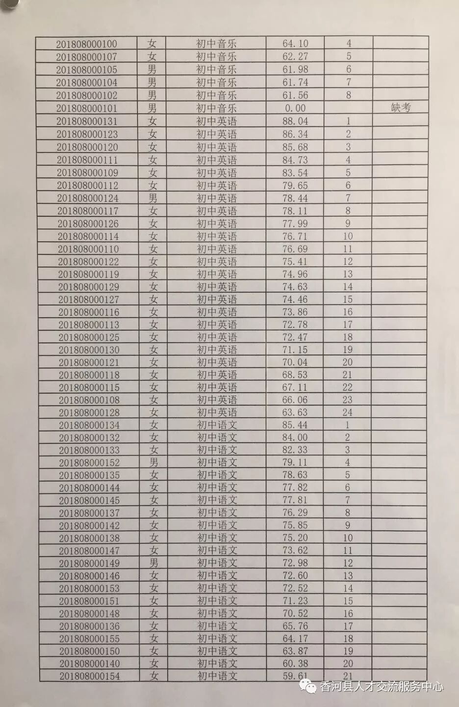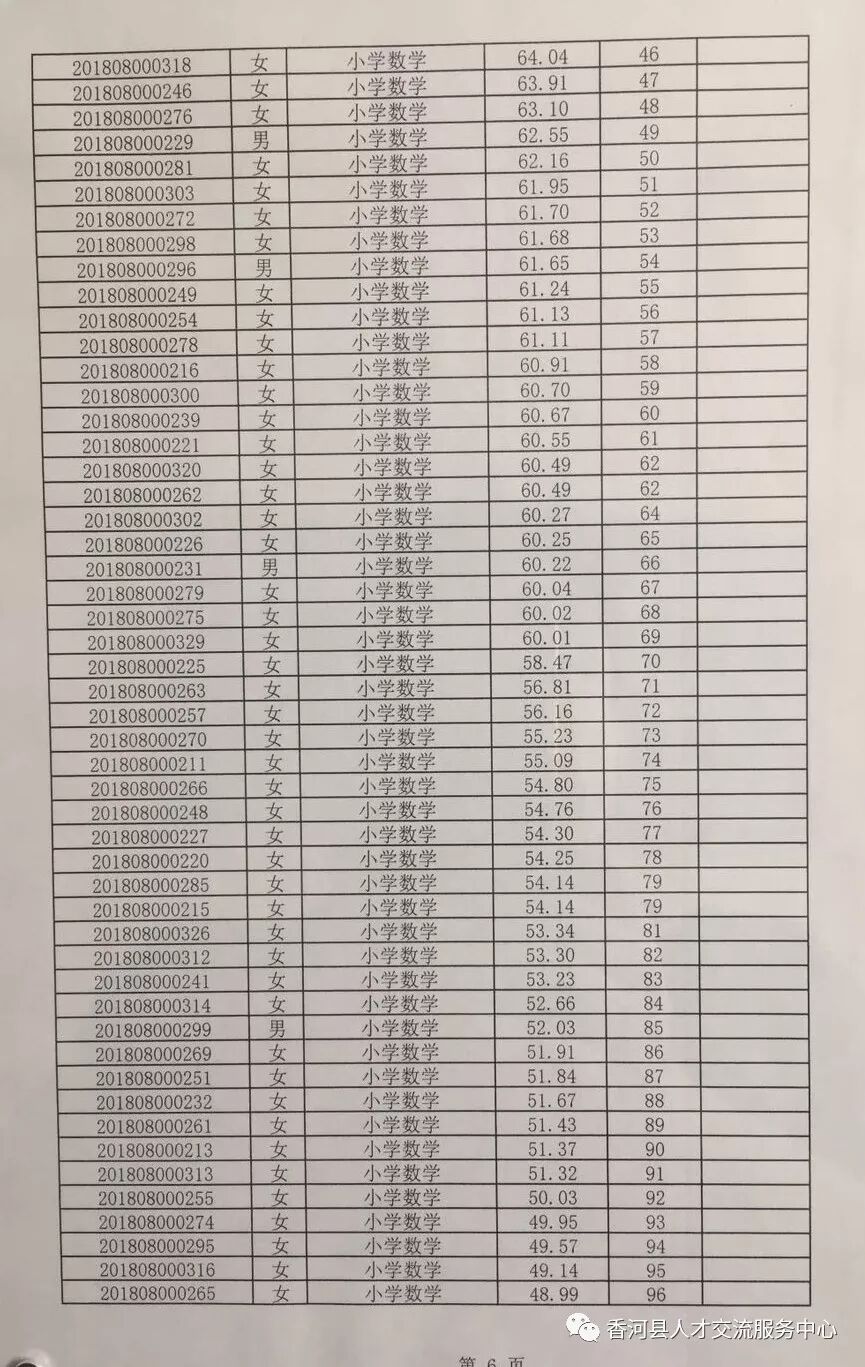 廊坊香河县2018年招聘合同制教师笔试成绩及排名