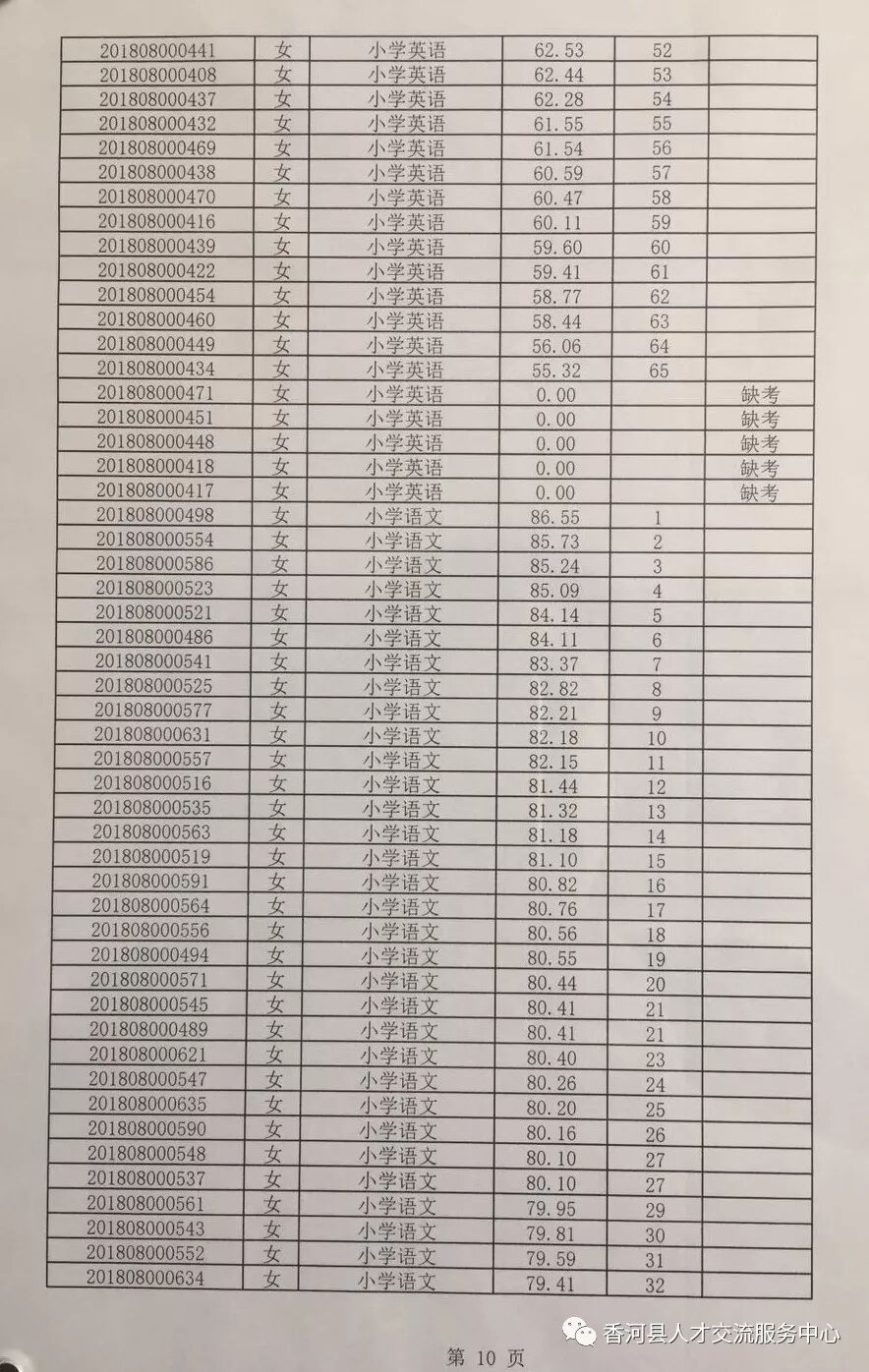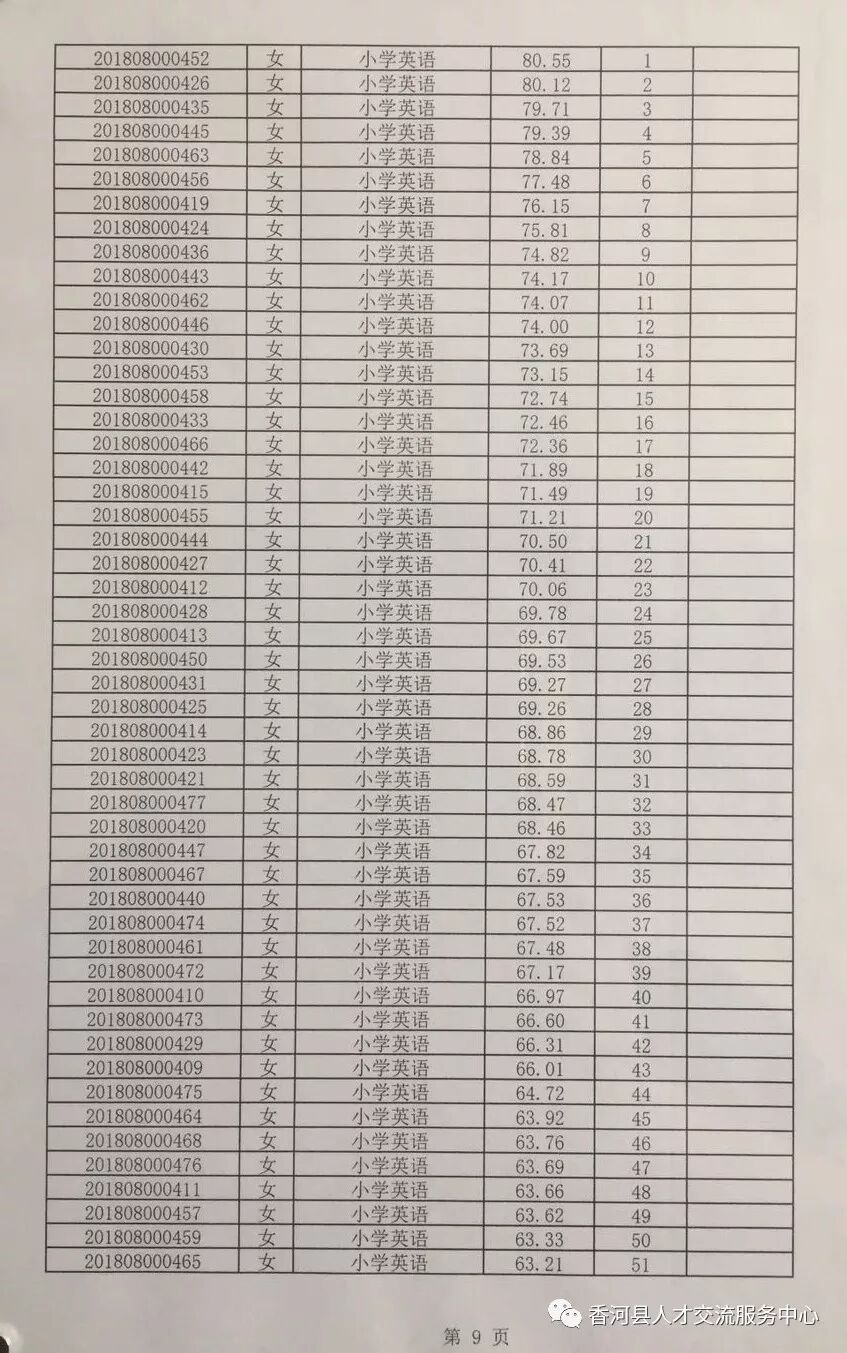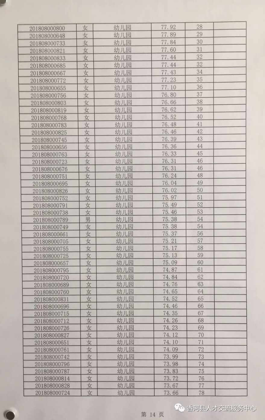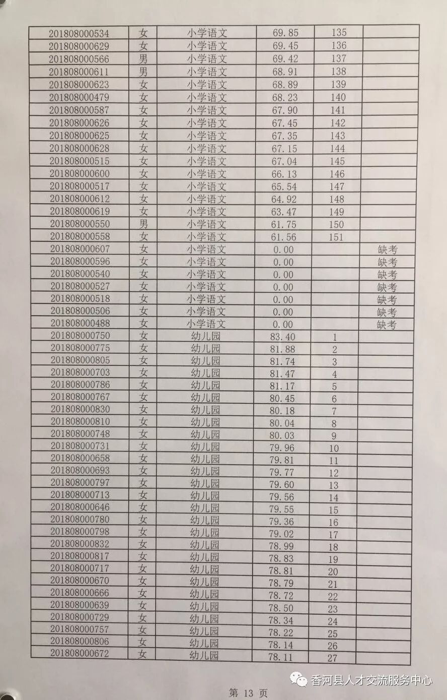 廊坊香河县2018年招聘合同制教师笔试成绩及排名