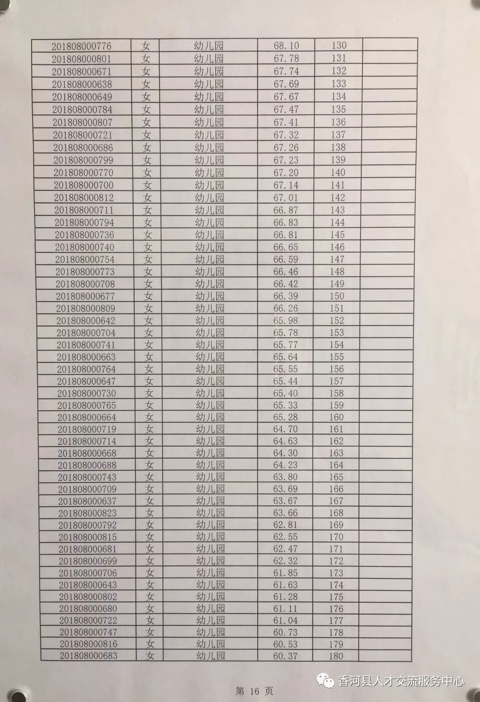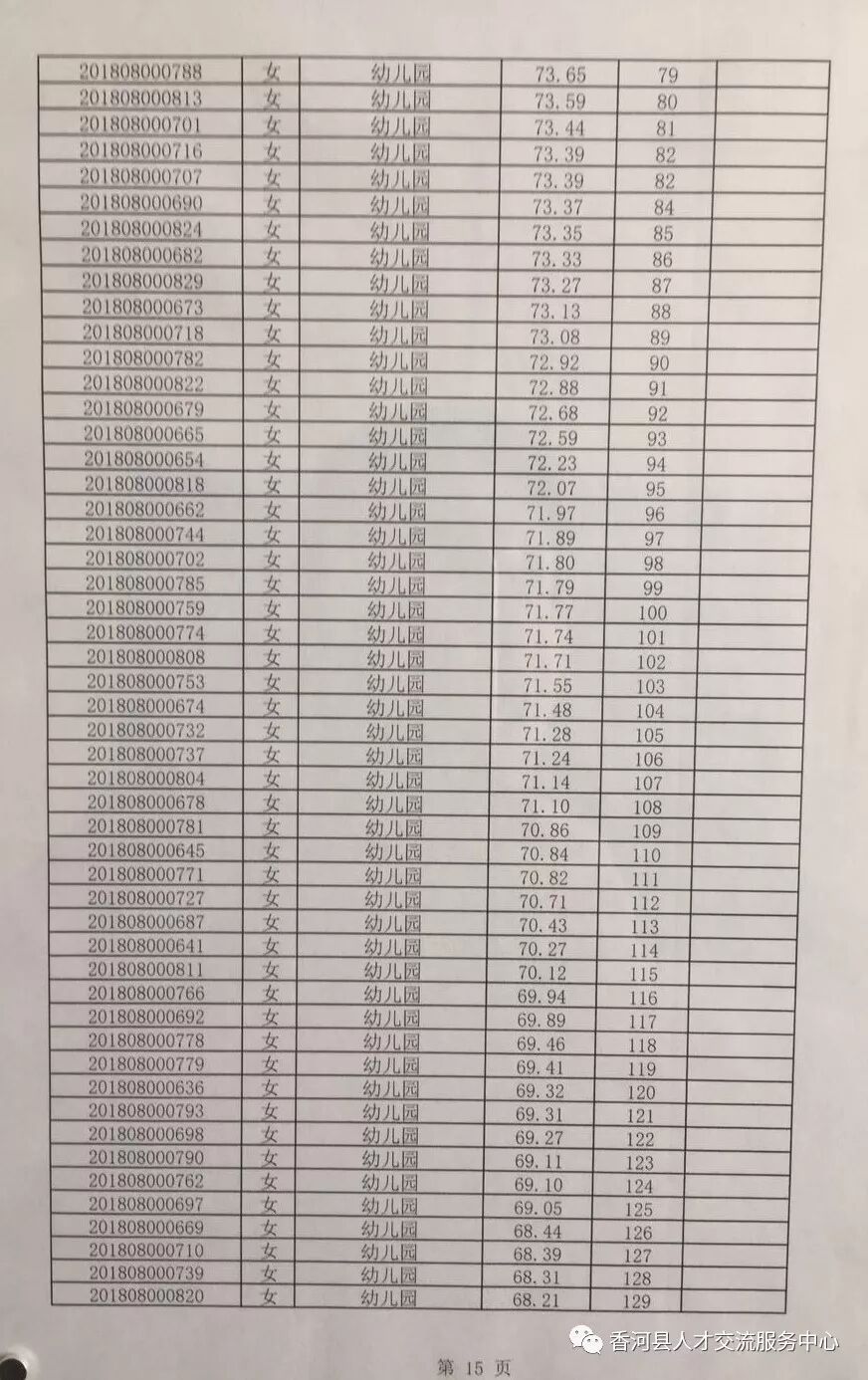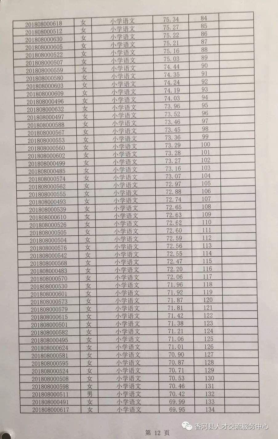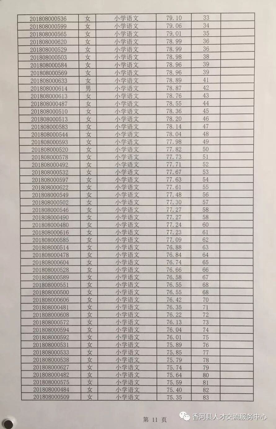 廊坊香河县2018年招聘合同制教师笔试成绩及排名