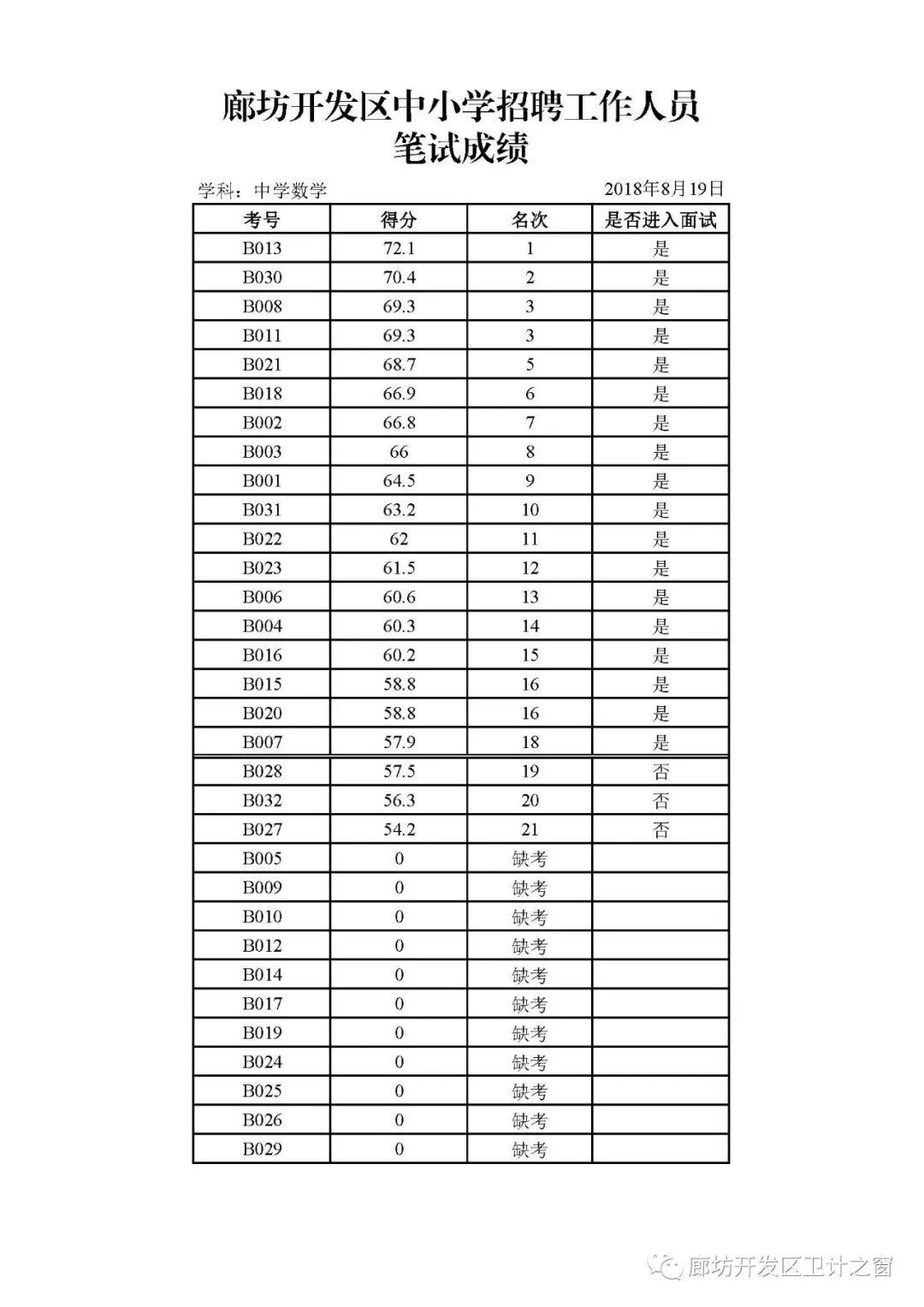 廊坊开发区2018年招聘中小学工作人员笔试成绩(中学数学)